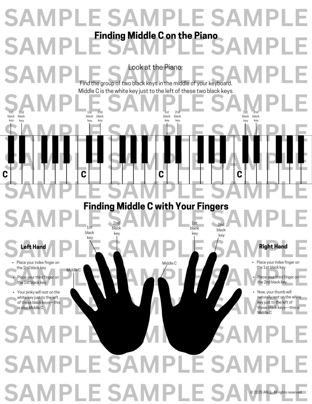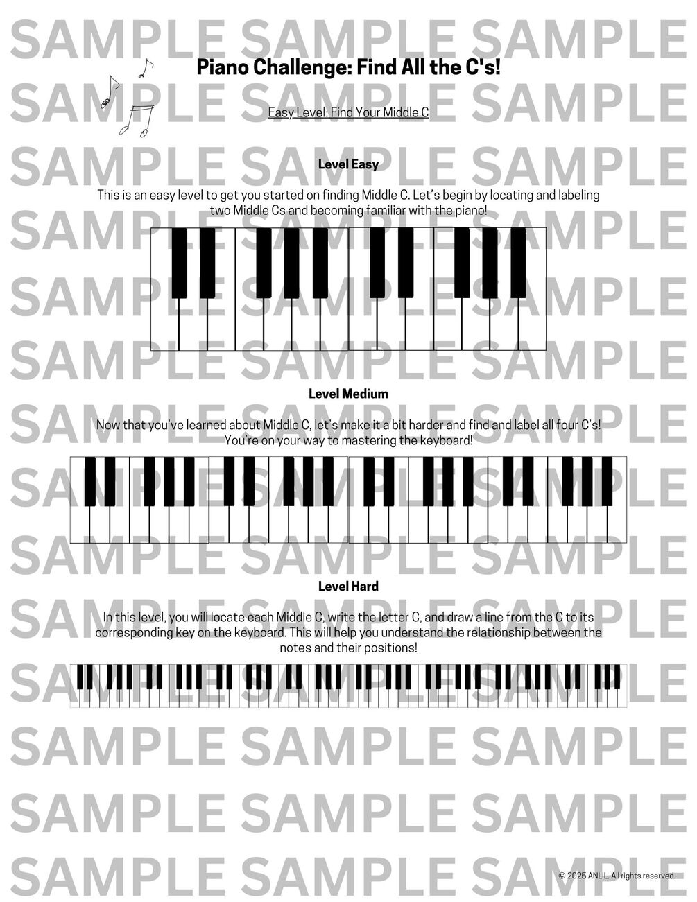 Get a 5-page PDF with a step-by-step guide to finding Middle C, including key info, fun facts, a questionnaire, and a worksheet, designed for beginners and neurodivergent learners.